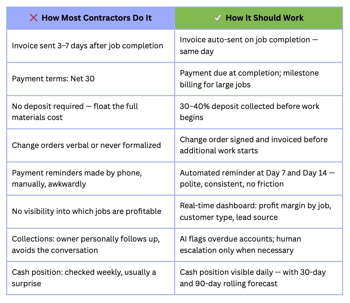 Send an invoice to every job completed in the last 14 days that hasn't been paid yet. Right now. Then send a follow-up to every invoice over 7 days old. That single action — done manually today, automated tomorrow — is typically worth $15,000–$40,000 in accelerated collections for a business doing $500K–$1M annually. It costs nothing. It takes an hour. The constraint is usually that it feels awkward to ask. It isn't awkward. It's your money.