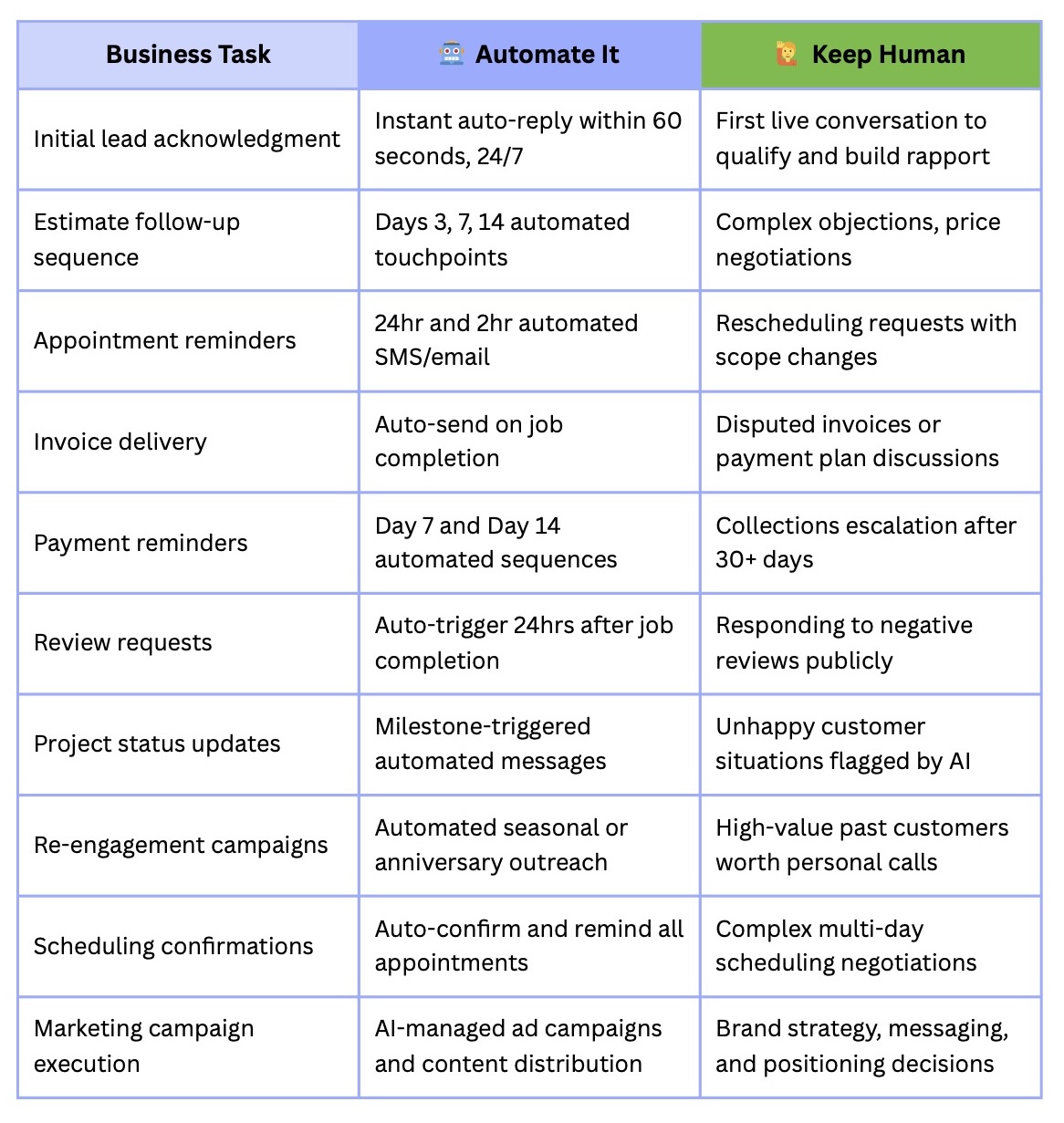 The single biggest time sink that can be fully automated immediately. Every inbound lead should receive an immediate acknowledgment, a follow-up call attempt within 5 minutes, and a nurture sequence that checks in at day 3, day 7, and day 14 if no response. Every sent estimate should trigger an automated follow-up sequence. None of this requires you. None of it should.